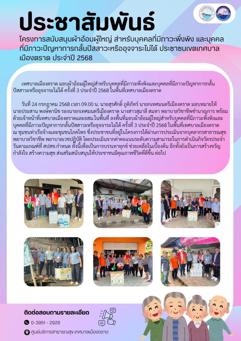 เทศบาลเมืองตราด มอบผ้าอ้อมผู้ใหญ่สำหรับบุคคลที่มีภาวะพึ่งพิงและบุคคลที่มีภาวะปัญหาการกลั้นปัสสาวะหรืออุจจาระไม่ได้ ครั้งที่ 3 ประจำปี 2568 ในพื้นที่เทศบาลเมืองตราด