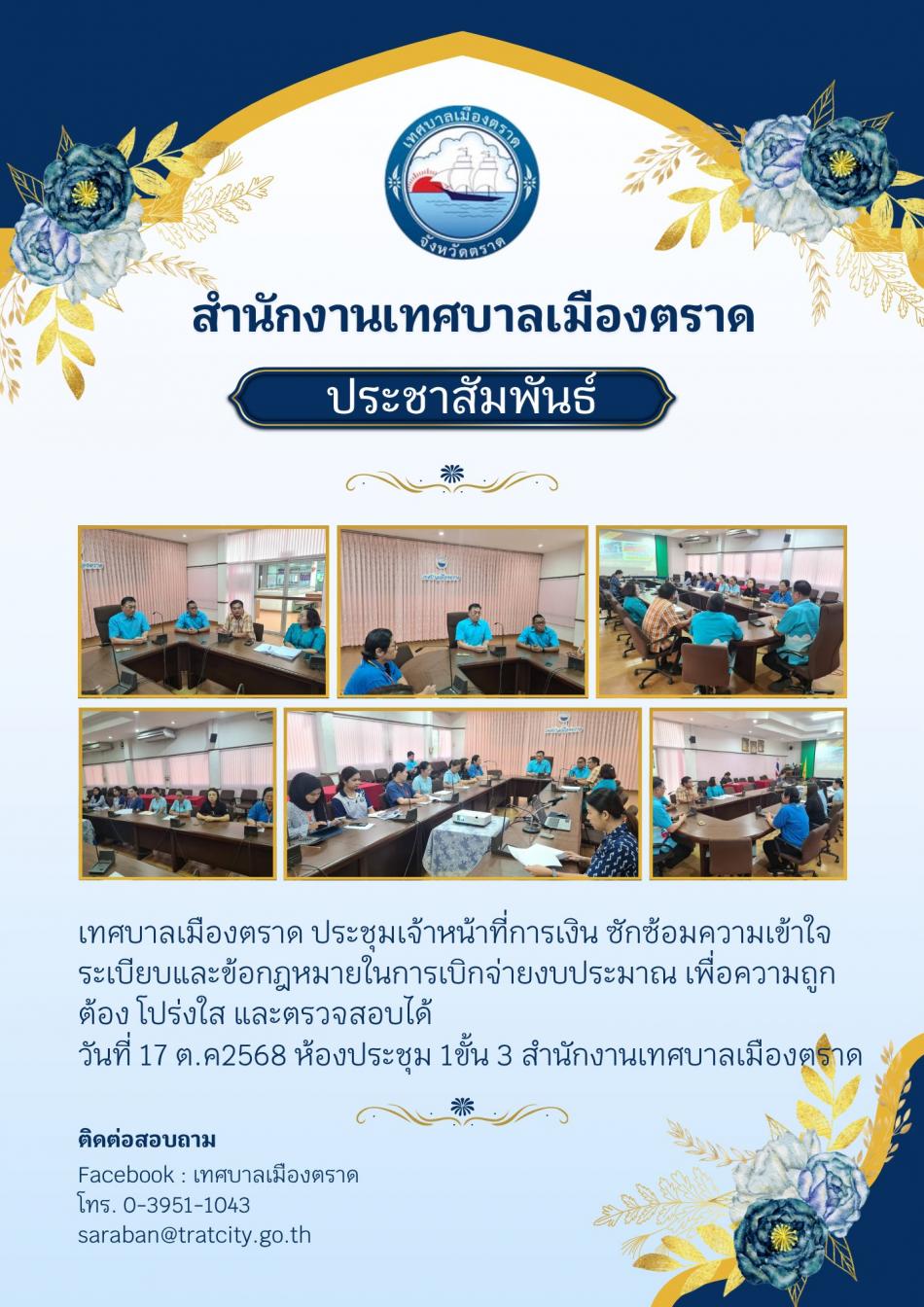 เทศบาลเมืองตราดประชุมเจ้าหน้าที่การเงิน ซักซ้อมความเข้าใจระเบียบและข้อกฎหมายในการเบิกจ่ายงบประมาณ เพื่อความถูกต้อง โปร่งใส และตรวจสอบได้ [17 ตุลาคม 2568]