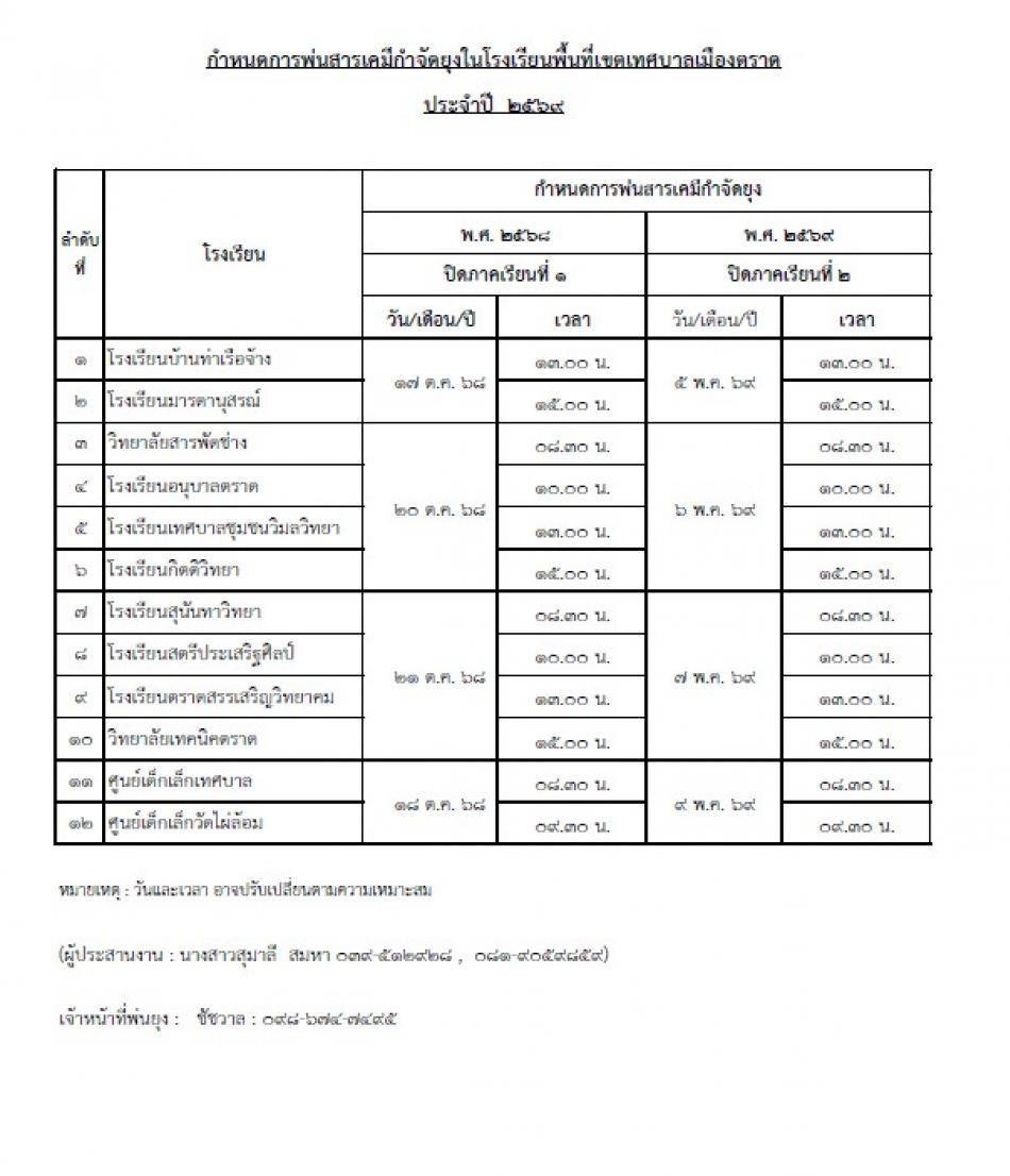 เทศบาลเมืองตราด ลงพื้นที่พ่นสารเคมีกำจัดยุงในโรงเรียน เขตเทศบาล ประจำปี 2569 [20 ตุลาคม 2568]