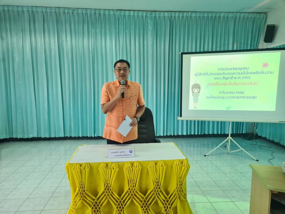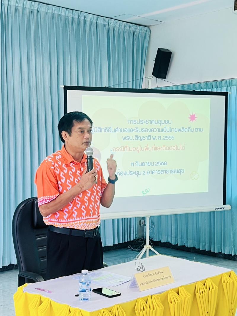 รายละเอียด : เมื่อวันที่ 11 กันยายน 2568 เวลา 10.00 น. ณ ห้องประชุม 2 อาคารกองสาธารณสุขและสิ่งแวดล้อม เทศบาลเมืองตราด นายสุรศักดิ์ ภูติภัทร์ นายกเทศมนตรีเมืองตราด ได้เป็นประธานการ ประชาคมชุมชนผู้ยื่นคำขอและรับรองความเป็นไทยพลัดถิ่น ตามพระราชบัญญัติสัญชาติ พ.ศ. 2555 โดยมี จ่าเอกไพศาล ยันต์วิเศษ ปลัดเทศบาลเมืองตราด เป็นผู้ดำเนินการ ซึ่งการดำเนินการครั้งนี้มีความสำคัญในการสร้างความ โปร่งใสและยุติธรรม เปิดโอกาสให้ชุมชนมีส่วนร่วมในการตรวจสอบและรับรองสิทธิ เพื่อให้ผู้ยื่นคำขอได้รับความมั่นใจและเป็นไปตามหลักสิทธิพื้นฐานของความเป็นไทย โดยมีคณะผู้บริหาร หัวหน้าส่วนราชการ และคณะกรรมการจาก ชุมชนรักษ์คลองบางพระ, ชุมชนวัดโบสถ์, ชุมชนหนองเสือพัฒนา, ชุมชนท่าเรือจ้าง และชุมชนโภคไพร เข้าร่วมอย่างพร้อมเพรียง