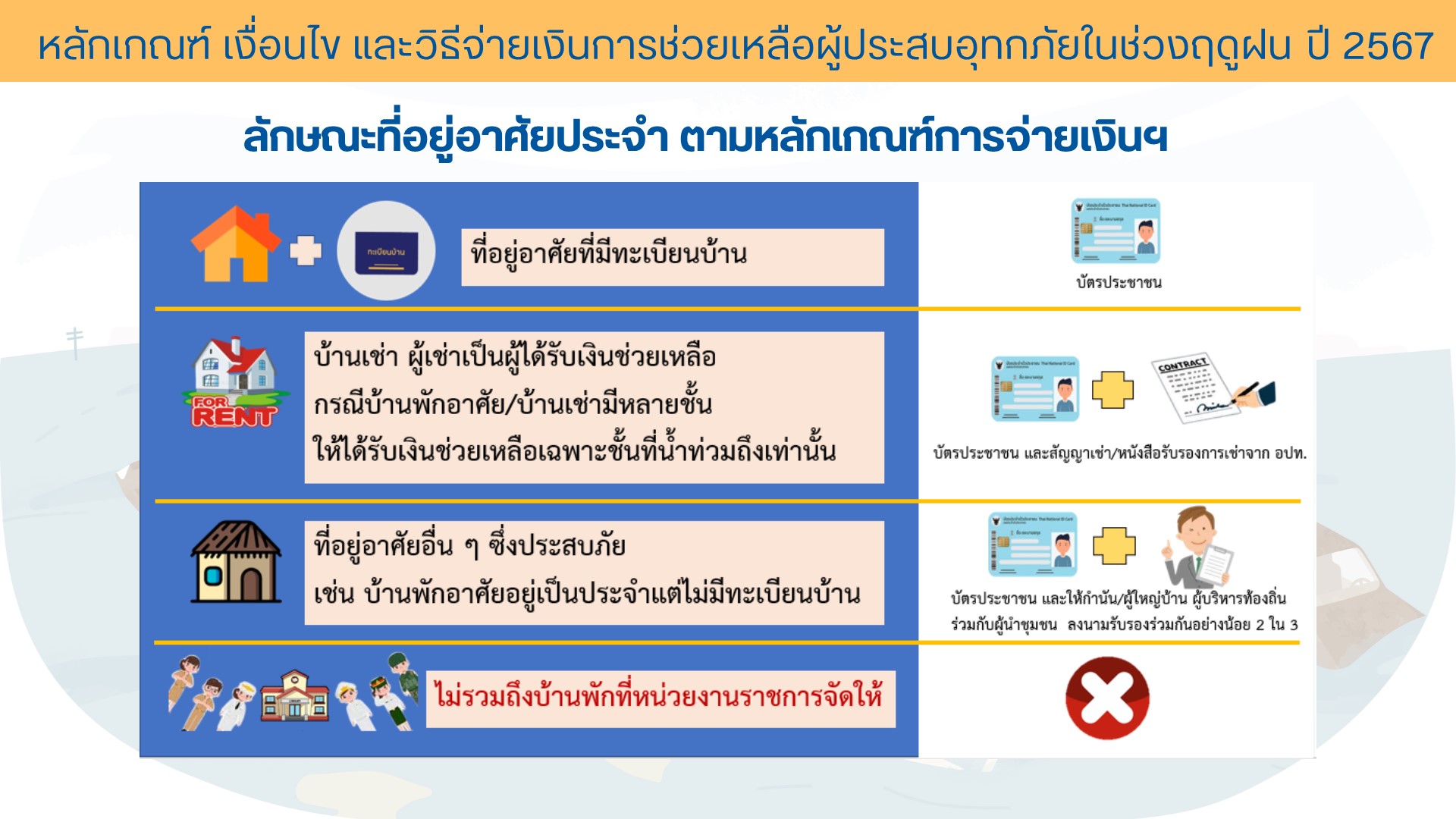 - บ้านเช่าต้องมีสัญญาเช่าหรือหนังสือรับรองบ้านเช่า (ผู้ให้เช่ามาเซ็นเอกสารพร้อมบัตรประจำตัวประชาชน)