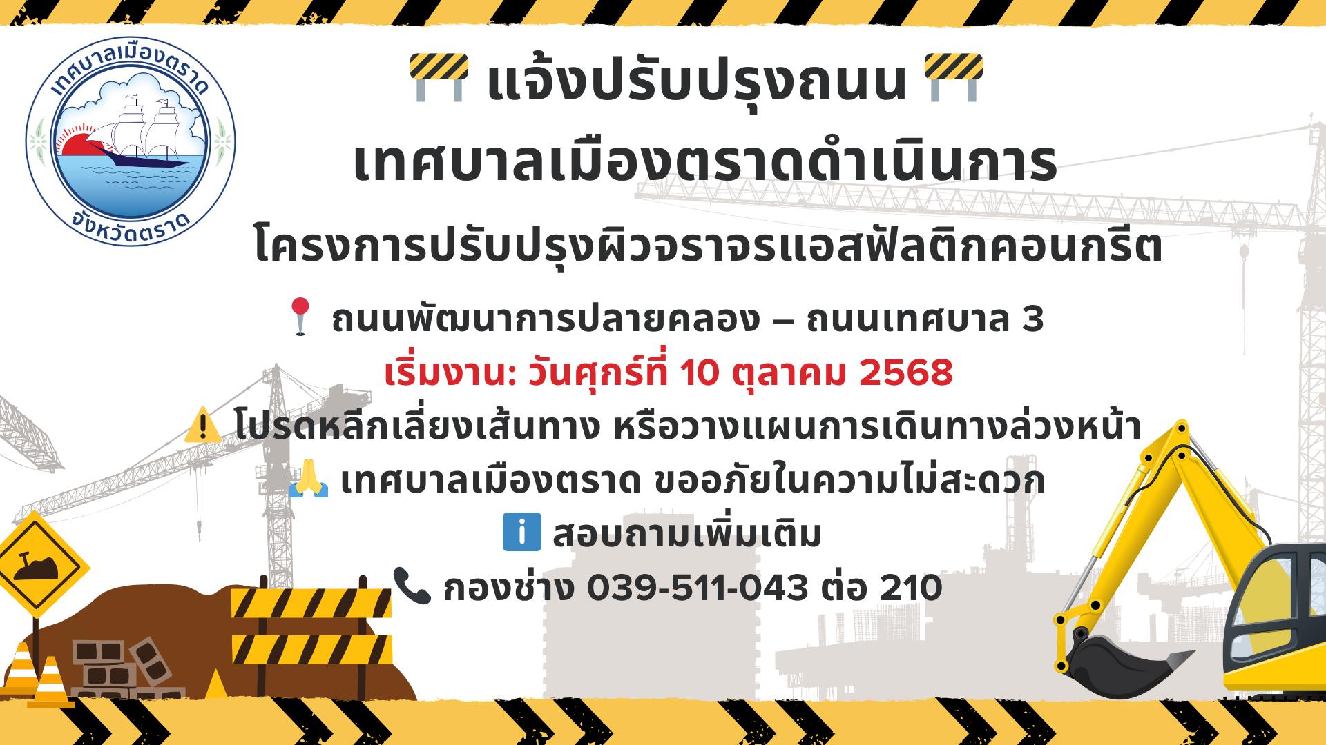 รายละเอียด : เทศบาลเมืองตราดขอแจ้งให้ประชาชนทราบว่า จะดำเนินการ โครงการปรับปรุงผิวจราจรแอสฟัลต์ติกคอนกรีต ซึ่งเป็นส่วนหนึ่งของการพัฒนาโครงสร้างพื้นฐานเพื่อเพิ่มความปลอดภัยและประสิทธิภาพในการสัญจร โดยจะเริ่มงานใน วันศุกร์ที่ 10 ตุลาคม 2568 ในเส้นทางสำคัญ คือ ถนนพัฒนาการปลายคลอง ไปจนถึงถนนเทศบาล 3 โครงการนี้อาจส่งผลให้เกิดความไม่สะดวกในการสัญจรในช่วงดำเนินการ จึงขอความร่วมมือประชาชนโปรดหลีกเลี่ยงเส้นทาง หรือวางแผนการเดินทางล่วงหน้า เทศบาลเมืองตราดขออภัยในความไม่สะดวกมา ณ โอกาสนี้ หากต้องการสอบถามรายละเอียดหรือแจ้งปัญหาเพิ่มเติม สามารถติดต่อ กองช่าง โทร. 039-511-043 ต่อ 210