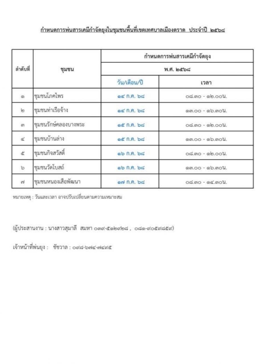 รายละเอียด : เทศบาลเมืองตราด ฉีดพ่นหมอกควันกำจัดยุง ระหว่างวันที่ 14 – 17 กรกฎาคม 2568 นายสุรศักดิ์ ภูติภัทร์ นายกเทศมนตรีเมืองตราด มอบหมายให้เจ้าหน้าที่กองสาธารณสุขและสิ่งแวดล้อม ดำเนินการฉีดพ่นหมอกควันกำจัดยุงและแมลง ตามโครงการควบคุมโรคไข้เลือดออก ครั้งที่ 4/2568 ครอบคลุมพื้นที่ 7 ชุมชน ในเขตเทศบาลเมืองตราด เพื่อป้องกันโรคไข้เลือดออก ไวรัสซิกา และชิคุนกุนยา --- ประชาชนควรปฏิบัติ ดังนี้ 1. ปิดอาหารและภาชนะให้มิดชิด 2. เก็บเสื้อผ้าและของใช้ให้พ้นสารเคมี 3. งดออกจากบ้านระหว่างพ่นสาร 4. เก็บสัตว์เลี้ยงที่ไม่มีกระดูกสันหลัง (เช่น กุ้ง ปู แมลง) ให้ปลอดภัย --- สอบถามเพิ่มเติม ศูนย์บริการสาธารณสุข เทศบาลเมืองตราด โทร. 0-3951-2928 ร่วมกันกำจัดยุงลาย ช่วยกันป้องกันไข้เลือดออก เทศบาลเมืองตราด ห่วงใยสุขภาพประชาขนทุกคน