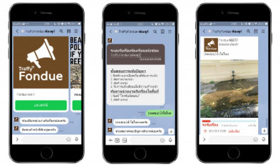 ผ่านการพูดคุย LINE @TraffyFondue 14 ประเภทปัญหาที่รับแจ้ง 1) ความสะอาด ขยะ 2) ไฟฟ้า ประปา 3) ไฟถนนเสีย 4) ถนน ทางเท้า 5) อาคารสถานที่ชำรุด 6) อุปกรณ์ครุภัณฑ์ชำรุด 7) จุดเสี่ยง 8) สาธารณภัย : น้ำท่วม ไฟไหม้ เผาไหม้ 9) ต้นไม้ กลิ่น เสียง สัตว์ 10) ขึ้นทะเบียน ประชาสัมพันธ์ 11) ความช่วยเหลือ 12) สุขขาภิบาล 13) เบาะแสทุจริต 14) อื่นๆ